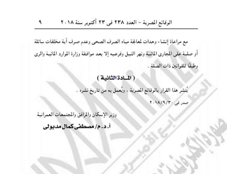 – مراعاة إنشاء وحدات لمعالجة مياه الصرف الصحي وعدم صرف أي مخلفات سائلة أو صلبة على المجاري المائية ونهر النيل وفرعيه، إلا بعد موافقة وزارة الموارد المائية والري وطبقًا للقوانين ذات الصلة.