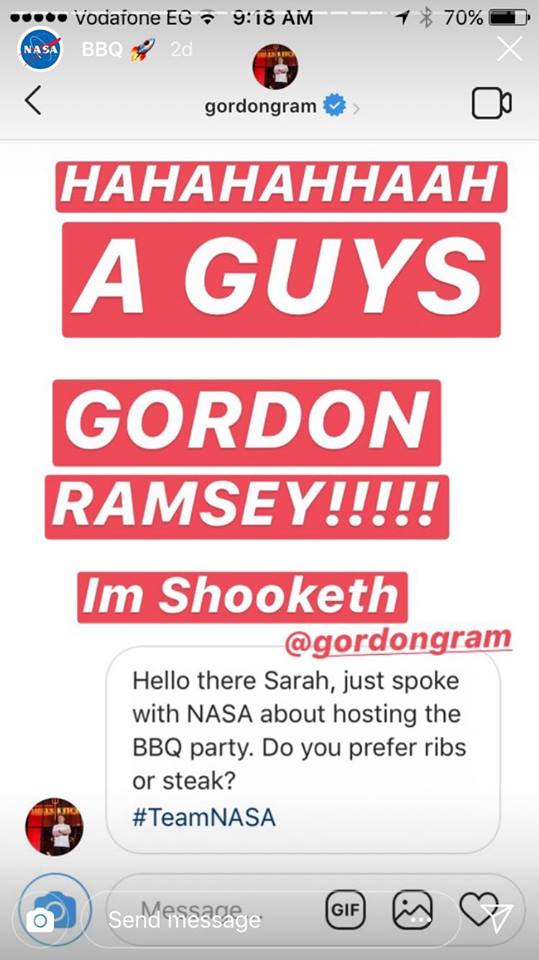 وعلى طريق المزاح، اقترحت سارة عبر حسابها الخاص على «انستجرام»، على وكالة الفضاء الأمريكية «ناسا»، وضع كميات من الدجاج واللحوم أسفل قواعد صواريخها التي تطلقها في الفضاء، من أجل إقامة حفلات للشواء موسعة حول العالم واستخدامها في القضاء على الجوع.
