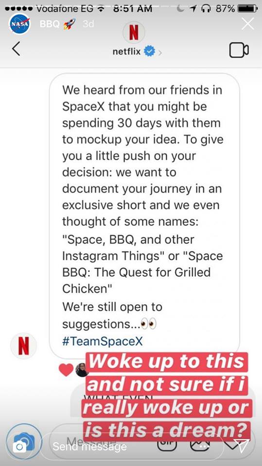 ولم يقتصر الأمر على استجابة وكالة ناسا لــ”سارة”، فقد اقترحت عليها الشركة المنافسة لوكالة ناسا “سبيس إكس”، قائلة: “إنها تطلعت على فكرتها وترغب في استضافتها لمدة شهر لمناقشة الأمر، وفقًا لما نشرته عبر حسابها على “إنستجرام”.